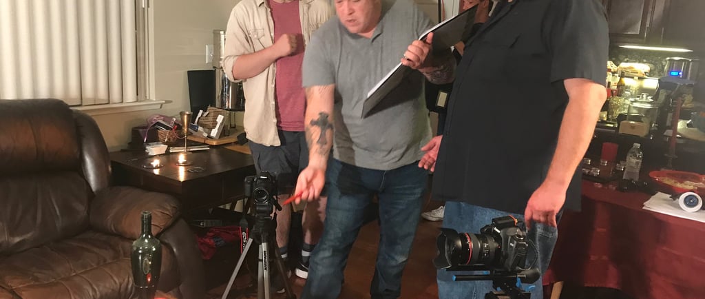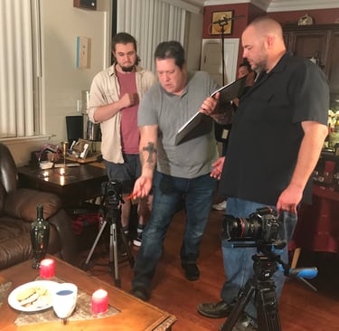 If the scene was lit too bright, it would take away from the drama, mystery, and the scariness of the scene. I am mainly a horror director, so many of my scenes don't require any harsh lighting, or direct lighting. For me, less is more when it comes to the horror genre. Also on the table, I have a plate of cookies, so that during the scene and between dialogue, one or more of the characters will grab a cookie, eat it etc. This allows the actor to do something with their body other than just talking. It allows them to create something organic and less robotic.